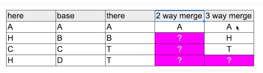 깃이 충돌을 처리하는 방법은 3 way merge 방식이다.