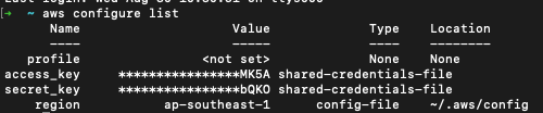 완료 후 터미널에서 aws configure list 명령어를 실행해서 잘 추가됐는지 확인한다.