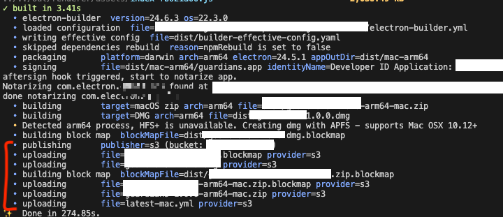 테스트로 deploy:mac-arm64 배포 스크립트를 실행하면 S3로 배포되는 것을 아래 로그에서 볼 수 있다.
