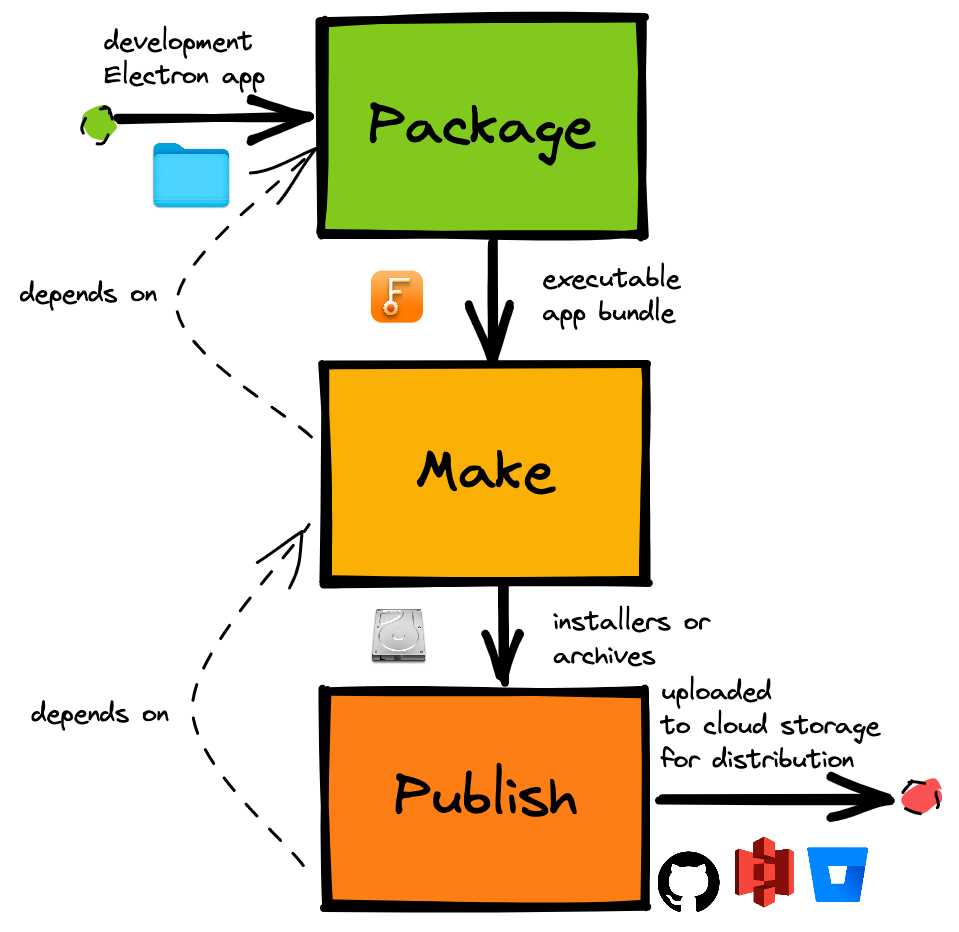 https://www.electronforge.io/core-concepts/build-lifecycle 데스크탑 애플리케이션을 빌드하고 배포하는 과정에서 주목해야 할 부분은 배포 가능한 파일을 생성하는 단계이다. 웹과 달리 패키징 단계에서 생성된 번들을 가지고 OS별 설치 프로그램을 생성해야 한다. 이 단계에서 대응하고자 하는 OS별, 플랫폼별로 모두 빌드해줘야 한다.