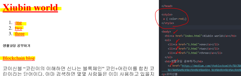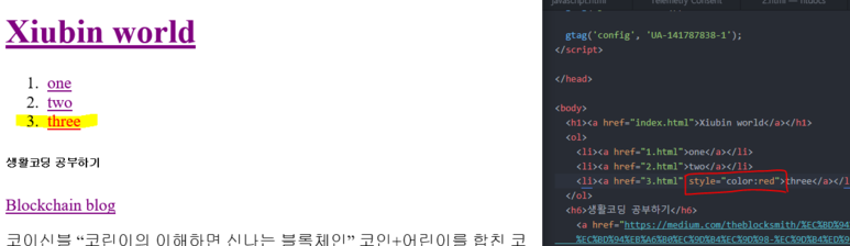 <h1><a href="index.html"><font color="red">Xiubin world</font></a></h1> <ol> <li><a href="1.html">one</a></li> <li><a href="2.html">two</a></li> <li><a href="3.html">three</a></li> </ol>a 태그가 걸린 곳에 기존 HTML 문법을 사용할 경우