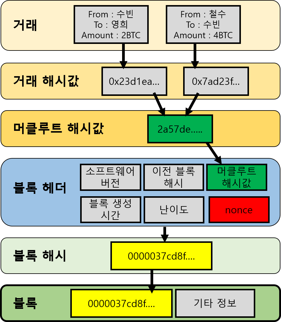 (※PoW : 블록 해시가 특정 숫자보다 낮게 나올 때의 nonce 값을 찾아내는 것이 작업 증명)
