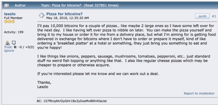 비트코인 최초활용2010년 bitcointalk 커뮤니티에서 한 유저가 비트코인 1만개와 피자 2판을 교환하는 글을 작성했다.