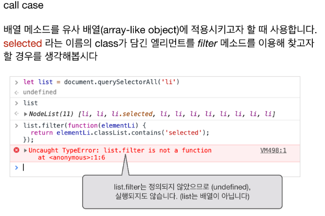 function moreThanFive(el) { return el.length > 5; } let arr = ['code', 'states']; arr.filter(moreThanFive); // ['states'] // 인스턴스 arr이 먼저 등장하고 메소드 filter가 뒤에 등장 Array.prototype.filter.call(arr, moreThanFive); // ['states'] // 메소드 filter가 먼저 등장하고 인스턴스 arr이 뒤에 등장2-2. call : 유사 배열에 배열 메소드를 적용하기