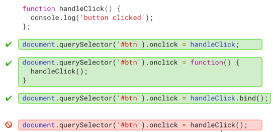 document.querySelector('#btn').addEventListener('click', function(el) { console.log('button clicked'); });※ 콜백함수는 함수 실행을 연결하는 것이 아니라 함수 자체를 연결하는 것이다.