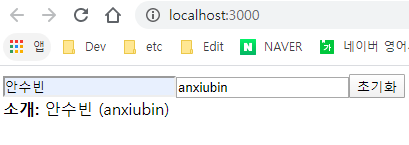 import React, { useState } from 'react'; function InputSample() { const [inputs, setInputs] = useState({ name: '', nickname: '' }); const { name, nickname } = inputs; const onChange = (e) => { const { value, name } = e.target; setInputs({ ...inputs, [name]: value }); }; const onReset = () => { setInputs({ name: '', nickname: '', }) }; return <div> <input name="name" placeholder="이름" onChange={onChange} value={name} /> <input name="nickname" placeholder="닉네임" onChange={onChange} value={nickname} /> <button onClick={onReset}>초기화</button> <div> <b> 소개: </b> {name} ({nickname}) </div> </div> ; } export default InputSample;const [inputs, setInputs] = useState({