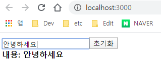 import React, { useState } from 'react'; function InputTest() { const [text, setText] = useState(''); const onChange = (e) => { setText(e.target.value); }; const onReset = () => { setText(''); }; return ( <div> <input onChange={onChange} value={text} /> <button onClick={onReset}>초기화</button> <div> <b> 내용: {text}</b> </div> </div> ); } export default InputTest;const onChange = (e) => {